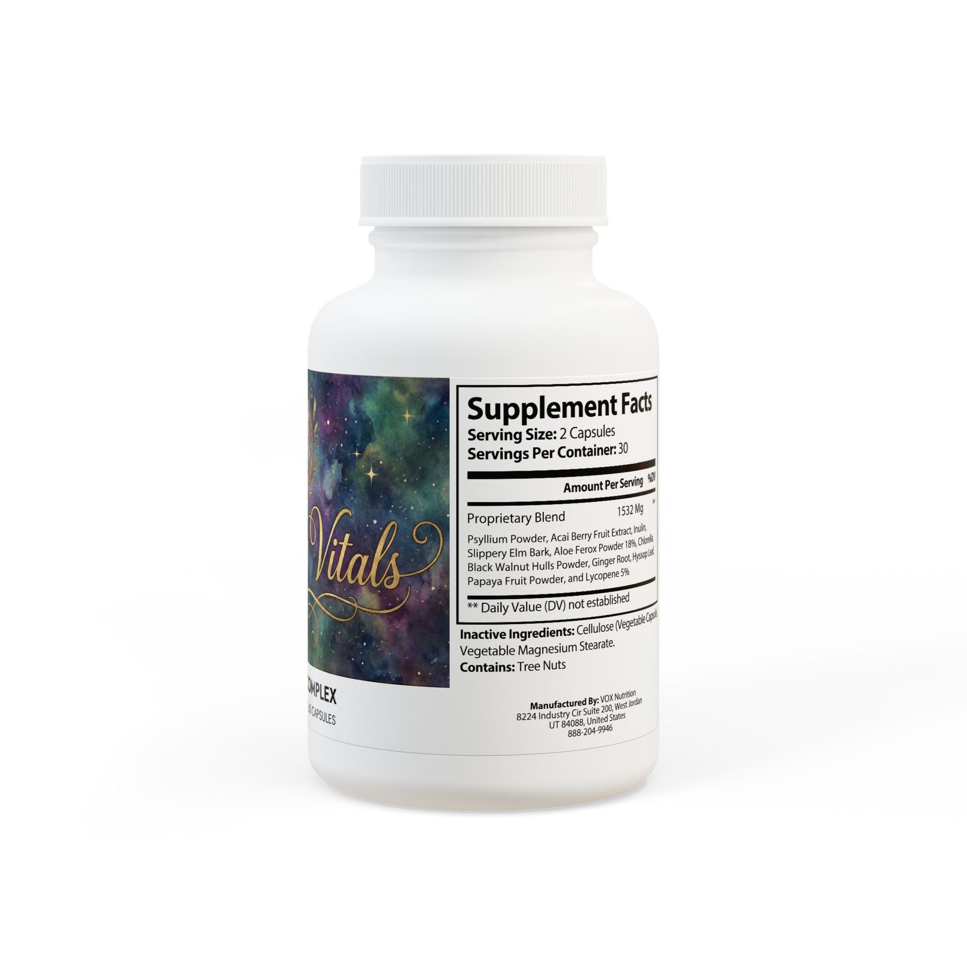 Ingredients: Psyllium Powder, Acai Berry Fruit Extract, Inulin, Slippery Elm Bark, Aloe Ferox Powder 18%, Chlorella, Black Walnut Hulls Powder, Ginger Root, Hyssop Leaf, Papaya Fruit Powder, and Lycopene 5%. Inactive Ingredients: Cellulose (Vegetable Capsule), Vegetable Magnesium Stearate. Contains: Tree Nuts