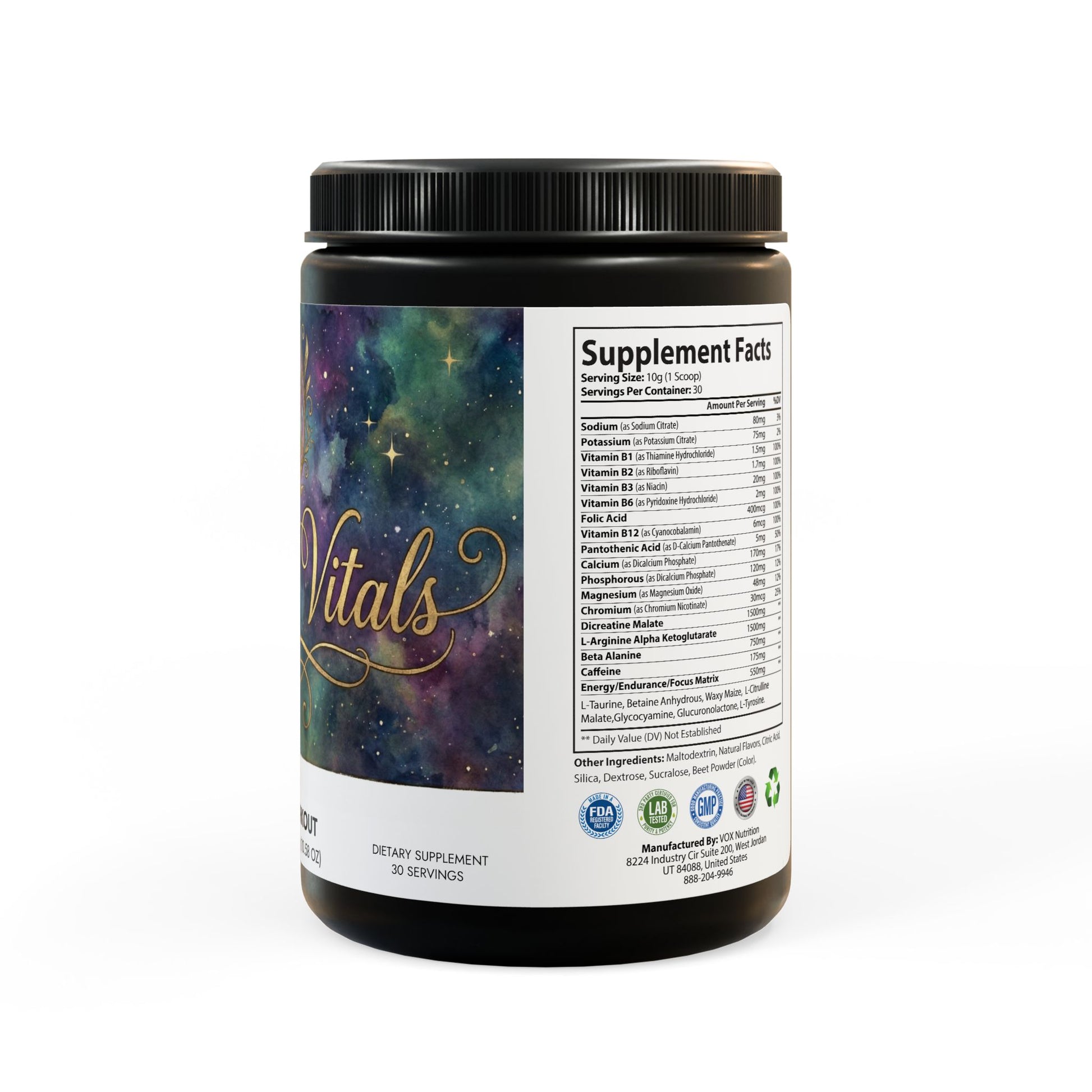 Ingredients: Sodium (as Sodium Citrate), Potassium (as Potassium Citrate), Vitamin B1 (as Thiamine Hydrochloride), Vitamin B2 (as Riboavin), Vitamin B3 (as Niacin), Vitamin B6 (as Pyridoxine Hydrochloride), Folic Acid, Vitamin B12 (as Cyanocobalamin), Pantothenic Acid (as D-Calcium Pantothenate), Calcium (as Dicalcium Phosphate), Phosphorous (as Dicalcium Phosphate), Magnesium (as Magnesium Oxide), Chromium (as Chromium Nicotinate), Dicreatine Malate, L-Arginine Alpha Ketoglutarate, Beta Alanine, Caffeine, L-Taurine, Betaine Anhydrous, Waxy Maize, L-Citrulline, Malate ,Glycocyamine, Glucuronolactone, L-Tyrosine. Other Ingredients: Maltodextrin, Natural Flavors, Citric Acid, Silica, Dextrose, Sucralose, Beet Powder (Color).